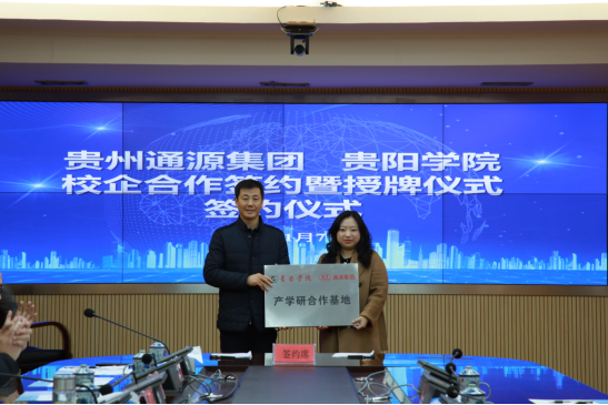 在签约和授牌环节,在校领导和现场师生见证下,通源集团人力资源SSC总监杨红与吴家福副经理在校企合作协议上签字。签字结束后,刘刚副董事长将“产学研合作基地”铜牌授予贵州通源集团。